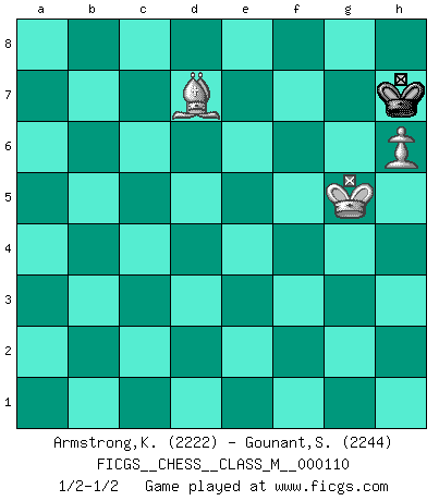 Last move : 1/2-1/2 2022 December 12 21:30:43 [Event "FICGS__CHESS__CLASS_M__000110"] [Site "FICGS"] [Date "2022.10.14"] [Round "1"] [White "Armstrong,Keith"] [Black "Gounant,Stanislas"] [Result "1/2-1/2"] [WhiteElo "2222"] [BlackElo "2244"] 1.Nf3 d5 2.g3 Nf6 3.Bg2 c6 4.O-O Bg4 5.c4 e6 6.Qb3 Qb6 7.h3 Bxf3 8.Bxf3 Nbd7 9.d4 Be7 10.Rd1 O-O 11.Qc2 a5 12.e3 a4 13.Nc3 dxc4 14.Nxa4 Qa6 15.Nc3 Nd5 16.b3 cxb3 17.Qxb3 N7b6 18.Be2 Qa5 19.Bb2 Qb4 20.Qc2 Rfc8 21.a3 Qd6 22.Qb3 h6 23.Rdc1 Nxc3 24.Bxc3 Nd5 25.Bd2 b5 26.a4 bxa4 27.Rxa4 Rxa4 28.Qxa4 Qa3 29.Qa6 Qxa6 30.Bxa6 Rc7 31.Ba5 Ra7 32.Rxc6 Bf8 33.e4 Ne7 34.Rb6 Nc8 35.Bxc8 Rxa5 36.Bd7 g5 37.Rb7 Ra8 38.e5 Ba3 39.Kg2 Kf8 40.Kf3 h5 41.Ke4 Be7 42.Rb2 Kg7 43.Rb7 Kf8 44.d5 exd5+ 45.Kxd5 Ra5+ 46.Ke4 Ra2 47.f3 Re2+ 48.Kf5 Rc2 49.Rb8+ Kg7 50.Re8 Ba3 51.Kxg5 Rc3 52.Kxh5 Rxf3 53.Kg4 Re3 54.Bc6 Bb4 55.h4 Rc3 56.Bd5 Rd3 57.Rd8 Rd4+ 58.Kh5 Be7 59.Rd7 Kf8 60.Bc6 Rxd7 61.Bxd7 Kg7 62.g4 Bd8 63.g5 Bc7 64.e6 fxe6 65.Kg4 Bd8 66.Kf4 e5+ 67.Kxe5 Bc7+ 68.Kf5 Bg3 69.h5 Kh7 70.Kf6 Bh4 71.h6 Bxg5+ 72.Kxg5 1/2-1/2 Follow this game move after move (download)Fischer prefers to enter Chess history alone. (Miguel Najdorf) Ich möchte Schüler heranbilden, die das Vermögen haben, selbst zu denken und Kritik zu üben. (Emanuel Lasker) El Ajedrez es un terrible juego. Si no controlas el centro, tu oponente tiene una posición mas holgada. Si tienes control del centro, ¡entonces realmente tu tienes algo de que preocuparte!. (Siegbert Tarrasch) Aidez vos pièces, elles vous aideront. (Paul Morphy) There are three kinds of lies: lies, damned lies and statistics. (Mark Twain)