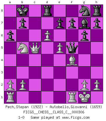 Last move : 1-0 2023 April 7 16:7:50 [Event "FICGS__CHESS__CLASS_C__000306"] [Site "FICGS"] [Date "2022.10.15"] [Round "1"] [White "Pech,Stepan"] [Black "Autobello,Giovanni"] [Result "1-0"] [WhiteElo "1922"] [BlackElo "1659"] 1.e4 c5 2.c3 Nc6 3.Nf3 d6 4.d4 cxd4 5.cxd4 Nf6 6.Nc3 Bg4 7.d5 Ne5 8.Nxe5 dxe5 9.Bb5+ Bd7 10.Bxd7+ Qxd7 11.f4 exf4 12.e5 Ng8 13.Bxf4 g6 14.O-O Bg7 15.Qf3 Qf5 16.d6 O-O-O 17.Nb5 Kb8 18.Qa3 a6 19.Qc5 1-0 This chess game has been lost on time (started : 2022.10.15 1:12:51) Follow this game move after move (download)When I have White, I win because I am white; When I have Black, I win because I am Bogolyubov. (Bogolyubov) Die Auseinandersetzung mit Karpow war politisch geprägt. Er stand für das kommunistische System, wurde von dessen Repräsentanten gehätschelt. Ich war der Oppositionelle. Jeder Schachweltmeister spiegelt auch die gesellschaftlichen Verhältnisse wider. Kramnik steht für die Börsen-Generation des Neuen Markts, ideologiefrei, zahlenfixiert. (Garry Kasparov) La vida es como un juego de Ajedrez, cambiando con cada movimiento. (Proverbio Chino) Un journaliste : 'Vous préférez avoir une dame de plus sur l'échiquier ou au lit ?' Boris Spassky : 'Ca dépend de la position.' You think that education is too expensive ? Try ignorance. (Derek Bok)