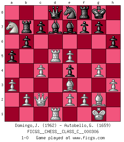 Last move : 1-0 2023 January 30 17:5:9 [Event "FICGS__CHESS__CLASS_C__000306"] [Site "FICGS"] [Date "2022.10.15"] [Round "1"] [White "Domingo,Jordi"] [Black "Autobello,Giovanni"] [Result "1-0"] [WhiteElo "1962"] [BlackElo "1659"] 1.g4 e5 2.c4 Nc6 3.Nc3 d6 4.h3 Nf6 5.Bg2 Bd7 6.Nf3 Be7 7.d3 O-O 8.Be3 a5 9.a3 h6 10.O-O b6 11.Qc2 Rb8 12.Rad1 Be6 13.Nb5 d5 14.d4 e4 15.Ne5 Nxe5 16.dxe5 Ne8 17.Na7 Bd7 18.Rxd5 Rb7 19.Rfd1 1-0 This chess game has been lost on time (started : 2022.10.15 1:12:51) Follow this game move after move (download)When you don't know what to play, wait for an idea to come into your opponent's mind. You may be sure that idea will be wrong. (Siegbert Tarrasch) Ich weiss nicht was Gott gegen mich auf 1.e4 antworten würde. (Robert James Fischer) El Ajedrez es despiadado: debes de estar preparado para matar gente. (Nigel Short) La vie et les Echecs sont tous les deux une lutte constante. (Lasker) Men should grow up. - Yeah. And dogs should stop licking themselves. It's not gonna happen. (Gregory House to Dr. Cameron, House M.D.)