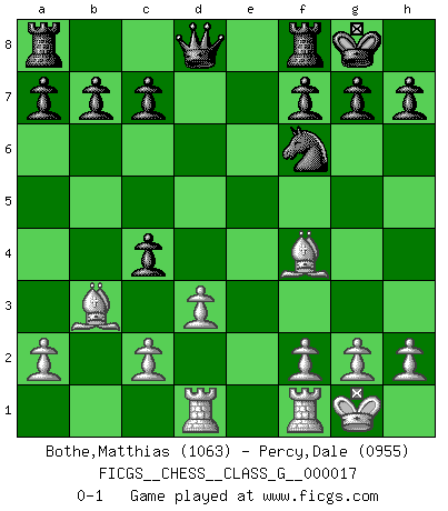 Last move : 0-1 2007 September 29 18:36:1 [Event "FICGS__CHESS__CLASS_G__000017"] [Site "FICGS"] [Date "2007.08.12"] [Round "1"] [White "Bothe,Matthias"] [Black "Percy,Dale"] [Result "0-1"] [WhiteElo "1063"] [BlackElo "0955"] 1.e4 e6 2.Bc4 Nf6 3.Nc3 Nc6 4.Nf3 Bc5 5.O-O O-O 6.d3 Nd4 7.Nxd4 Bxd4 8.Bf4 Bxc3 9.bxc3 d5 10.exd5 exd5 11.Bb3 Bg4 12.c4 Bxd1 13.Raxd1 dxc4 0-1 French defense Kingside Castling by player White (move 5) Kingside Castling by player Black (move 5) Player Black won this chess game. Follow this game move after move (download)A man without frontiers. He didn't divide the East and the West, he brought them together in their admiration for him. (Ljubomir Ljubojevic, about Bobby Fischer's death) Schach ist ein Teil der Kultur, und wenn es mit der Kultur abwärts geht, geht es auch mit dem Schach abwärts. (Mikhail Moiseyevich Botvinik) La vida es como el Ajedrez, con lucha, competición y eventos buenos y malos. (Benjamin Franklin) Les échecs, c'est l'imagination. (David Bronstein) Treat your password like your toothbrush. Don't let anybody else use it, and get a new one every six months. (Clifford Stoll)