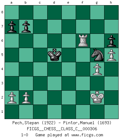 Last move : 1-0 2023 May 15 12:16:30 [Event "FICGS__CHESS__CLASS_C__000306"] [Site "FICGS"] [Date "2022.10.15"] [Round "1"] [White "Pech,Stepan"] [Black "Pintor,Manuel"] [Result "1-0"] [WhiteElo "1922"] [BlackElo "1693"] 1.d4 d5 2.c4 c6 3.Nf3 Bg4 4.e3 Nf6 5.Nc3 e6 6.h3 Bh5 7.g4 Bg6 8.Ne5 Bb4 9.h4 h6 10.Nxg6 fxg6 11.Qc2 Ne4 12.cxd5 exd5 13.f3 Ng3 14.Qxg6+ Kf8 15.Rh3 Nxf1 16.Kxf1 Nd7 17.Ne2 Qf6 18.Nf4 Bd6 19.Qxf6+ Nxf6 20.Ng6+ Kf7 21.Nxh8+ Rxh8 22.h5 Re8 23.Bd2 Nd7 24.Re1 Nb6 25.e4 dxe4 26.fxe4 Nc4 27.Rf3+ Ke6 28.Bc3 Rf8 29.Rxf8 Bxf8 30.d5+ cxd5 31.exd5+ Kxd5 32.Kg2 Nd6 33.Rf1 Be7 34.Bxg7 Bg5 35.Bf6 Ne4 36.Bxg5 Nxg5 37.Rf6 1-0 Follow this game move after move (download)Chess is war over the board. The object is to crush the opponents mind. (Bobby Fischer) Ohne Leiden bildet sich kein Charakter. (Ernst Freiherr von Feuchtersleben) A la fecha, Fischer esta simplemente un nivel arriba de todos los mejores jugadores de Ajedrez del mundo. (John Jacobs) En blitz, le Cavalier l'emporte sur le Fou. (Vlastimil Hort) Somehow our devils are never quite what we expect when we meet them face to face. (Nelson DeMille)