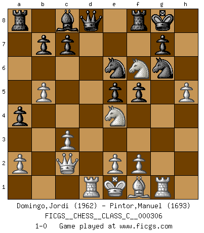 Last move : 1-0 2022 November 7 1:48:16 [Event "FICGS__CHESS__CLASS_C__000306"] [Site "FICGS"] [Date "2022.10.15"] [Round "1"] [White "Domingo,Jordi"] [Black "Pintor,Manuel"] [Result "1-0"] [WhiteElo "1962"] [BlackElo "1693"] 1.g4 e5 2.d3 Bc5 3.Nf3 Nc6 4.c3 d6 5.h3 h6 6.b4 Bb6 7.Nbd2 Nf6 8.Qc2 O-O 9.Rg1 a5 10.b5 Ne7 11.Nc4 Bc5 12.g5 hxg5 13.Nxg5 Ng6 14.Be3 Bxe3 15.Nxe3 Nh5 16.d4 Nhf4 17.dxe5 dxe5 18.h4 a4 19.h5 Ne6 20.Rd1 Qf6 21.Nd5 Qd8 22.Ne4 f5 23.Ndf6+ 1-0 Follow this game move after move (download)Of Chess it has been said that life is not long enough for it, but that is the fault of life, not Chess. (William Ewart Napier) Ich verachte die Medien. (Robert James Fischer) El jugador de combinación piensa hacia adelante; comienza de la posición dada y trabaja las movidas contundentes en su mente. (Emanuel Lasker) Le succès, c'est être capable d'aller d'échec en échec sans perdre son enthousiasme. (Winston Churchill) He is a liar. I just don't know what the lie is yet. (Horatio Caine, C.S.I. Miami)