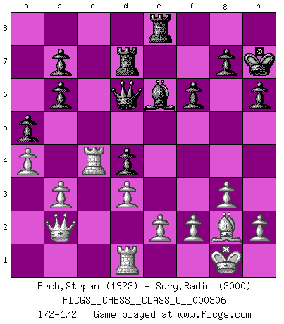 Last move : 1/2-1/2 2023 April 5 4:9:46 [Event "FICGS__CHESS__CLASS_C__000306"] [Site "FICGS"] [Date "2022.10.15"] [Round "1"] [White "Pech,Stepan"] [Black "Sury,Radim"] [Result "1/2-1/2"] [WhiteElo "1922"] [BlackElo "2000"] 1.c4 e5 2.Nc3 Nf6 3.Nf3 Nc6 4.g3 d5 5.cxd5 Nxd5 6.Bg2 Bc5 7.O-O O-O 8.d3 h6 9.Nxd5 Qxd5 10.Nd2 Qd8 11.Qc2 Bb6 12.Nc4 Nd4 13.Qd1 Re8 14.Re1 Nc6 15.a4 a5 16.Nxb6 cxb6 17.Be3 Re7 18.Rc1 Nb4 19.Qb3 Be6 20.Qa3 Na2 21.Ra1 Nb4 22.Rac1 Qd6 23.b3 Rd7 24.Qb2 f6 25.Bd2 Nc6 26.Rc4 Kh7 27.Bc3 Re8 28.Rd1 Nd4 29.Bxd4 exd4 1/2-1/2 Follow this game move after move (download)What is the difference between chess and football? Everybody understands football, but nobody plays it. Everybody plays chess, but nobody understands it. Everything is relative. (Vladimir Kramnik) Man wirke der falschen Auffassung entgegen, als ob jeder Zug Unmittelbares zu leisten habe; auch Werte- und Ruhezüge haben ihre Existenzberechtigung. (Aaron Nimzowitsch) Yo he agregado estos principios a la ley: pongan los Caballos en acción antes de que los dos Alfiles sean desarrollados. (Emanuel Lasker) L'action d'une oeuvre littéraire se déroule sur un champ de bataille. Les masques et les types du drame moderne correspondent aux pièces du jeu d'échecs. L'intrigue correspond aux coups et aux gambits, c'est à dire aux techniques du jeu telles qu'utilisées et interprétées par les joueurs. Les tactiques et les péripéties [mouvements] correspondent aux coups exécutés par l'adversaire. (Viktor Shklovsky) A good programmer is someone who always looks both ways before crossing a one-way street. (Doug Linder)
