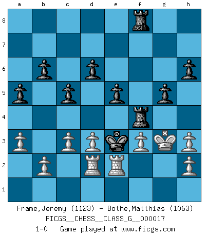 Last move : 1-0 2007 October 23 13:5:13 [Event "FICGS__CHESS__CLASS_G__000017"] [Site "FICGS"] [Date "2007.08.12"] [Round "1"] [White "Frame,Jeremy"] [Black "Bothe,Matthias"] [Result "1-0"] [WhiteElo "1123"] [BlackElo "1063"] 1.e4 e5 2.Nf3 Nc6 3.Bc4 h6 4.Nc3 Nf6 5.d3 Bc5 6.Be3 g5 7.Bxc5 b6 8.Be3 d6 9.a3 a5 10.O-O Ng4 11.Bd5 Qd7 12.Qe2 f6 13.Bxc6 Qxc6 14.Nd5 Be6 15.Nc3 Nxe3 16.Qxe3 f5 17.exf5 Bxf5 18.Nd4 Qd7 19.Nxf5 Qxf5 20.Nd5 Kd7 21.Qh3 Qxh3 22.gxh3 Rhf8 23.f3 Rac8 24.Rf2 Ke6 25.Raf1 Kxd5 26.Kg2 Rf4 27.Kg3 Kd4 28.Rd2 c5 29.c3+ Ke3 30.R1f2 Rcf8 31.Rfe2+ 1-0 King's pawn game Kingside Castling by player White (move 10) Player White won this chess game. Follow this game move after move (download)Chess is war over the board. The object is to crush the opponents mind. (Bobby Fischer) Wer mein Gambit spielt, muß bereit sein, alle Brücken hinter sich abzubrechen. Es verändert den ganzen Menschen. Es wirkt wie ein Zauberstab und fördert verkümmerte, gute Charakter- eigenschaften wieder zu Tage. (Emil Joseph Diemer) Me gusta decir que Bobby Fischer fue el mejor jugador que jamás haya existido. Pero lo que hizo de Fischer un genio, fue su habilidad de mezclar una frescura y pragmatismo Americano con ideas Rusas acerca de la estrategia. (Bruce Pandolfini) En blitz, le Cavalier l'emporte sur le Fou. (Vlastimil Hort) My poor ole parrot... Is not in the circulation of displays ....poo hoo hoo :) (Wayne Lowrance's enigma)