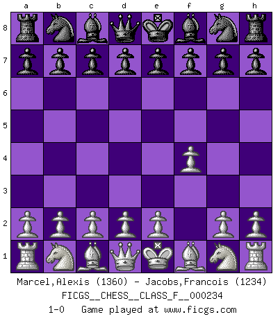 Last move : 1-0 2022 November 26 6:41:43 [Event "FICGS__CHESS__CLASS_F__000234"] [Site "FICGS"] [Date "2022.10.16"] [Round "1"] [White "Marcel,Alexis"] [Black "Jacobs,Francois"] [Result "1-0"] [WhiteElo "1360"] [BlackElo "1234"] 1.f4 1-0 This chess game has been lost on time (started : 2022.10.16 23:3:30) Follow this game move after move (download)Chess is a fighting game which is purely intellectual and includes chance. (Richard Reti) Korrekt heißt in Deutschland die Haltung eines Mannes, dessen Benehmen nach dem Urteile seiner Nachbarn seiner Stellung angemessen ist. Um korrekt zu sein, muß man sich der Meinung der anderen anpassen... (Emanuel Lasker) El Ajedrez es una guerra en un tablero. El objetivo es aplastar la mente del oponente. (Bobby Fischer) Vous m'avez demandé de vous exposer quel est le fondement de la prière. Je ne fais que préparer les pièces du jeu sur la table... Nous sera-t-il permis d'en adopter les règles et si nous les appliquons scrupuleusement nous ne tarderons pas à faire mat le Roi divin ! Il ne pourra échapper à nos mains. (Sainte Thérèse d'Avila, Chemin de perfection) The obstacle is the path. (Zen proverb)