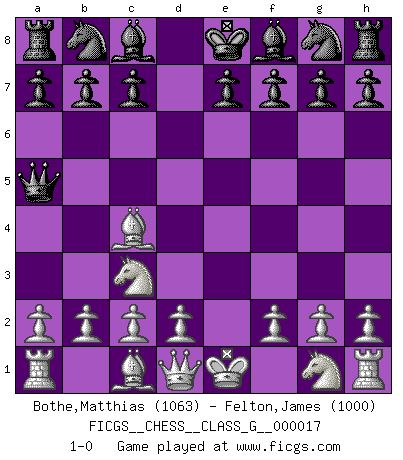 Last move : 1-0 2007 October 6 5:47:11 [Event "FICGS__CHESS__CLASS_G__000017"] [Site "FICGS"] [Date "2007.08.12"] [Round "1"] [White "Bothe,Matthias"] [Black "Felton,James"] [Result "1-0"] [WhiteElo "1063"] [BlackElo "1000"] 1.e4 d5 2.exd5 Qxd5 3.Nc3 Qa5 4.Bc4 1-0 This chess game has been lost on time (started : 2007.08.12 23:39:2) Scandinavian (centre counter) defense Player White won this chess game. Follow this game move after move (download)The only thing Chess players have in common is Chess. (Lodewijk Prins) Garry Kasparov war erst in der Großmeister-Organisation GMA, dann in der Profischach-Vereinigung PCA, zum Schluss kehrte er wieder in den Schoß der FIDE zurück. Aber gut, manche Leute sind flexibel (Viswanathan Anand) El Ajedrez es un terrible juego. Si no controlas el centro, tu oponente tiene una posición mas holgada. Si tienes control del centro, ¡entonces realmente tu tienes algo de que preocuparte!. (Siegbert Tarrasch) Je ne suis pas le dernier à jouer lâchement des coups douteux pendant le zeïtnot de l'adversaire pour l'achever: en effet les coups qui font le plus peur sont ceux que l'on ne comprend pas. Je me fais souvent peur quand je joue. (Un professeur anonyme) Wisdom doesn't necessarily come with age. Sometimes age just shows up all by itself. (Tom Watson)