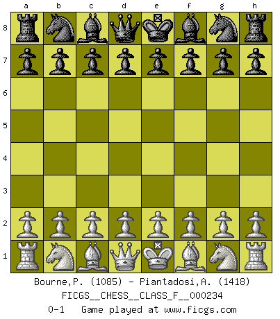 Last move : 0-1 2022 November 26 6:41:43 [Event "FICGS__CHESS__CLASS_F__000234"] [Site "FICGS"] [Date "2022.10.16"] [Round "1"] [White "Bourne,Patrick"] [Black "Piantadosi,Angelo"] [Result "0-1"] [WhiteElo "1085"] [BlackElo "1418"] 0-1 This chess game has been lost on time (started : 2022.10.16 23:3:30) Follow this game move after move (download)A Chess game is divided into three stages: the first, when you hope you have the advantage, the second when you believe you have an advantage, and the third... when you know you're going to lose ! (Savielly Tartakower) Der Bart als Geschlechtszeichen mitten im Gesicht ist obszön. Daher gefällt er den Weibern. [Zugegeben, kein Schachzitat, aber unglaublich originell] (Arthur Schopenhauer) El Ajedrez es la vida. (Bobby Fischer) Tous ces prétendus hommes politiques sont les pions, les Cavaliers, les Tours ou les Fous d'une partie d'échecs qui se jouera tant qu'un hasard ne renversera pas l'échiquier. (Honoré de Balzac) I'll be back. (Arnold Schwarzenegger)
