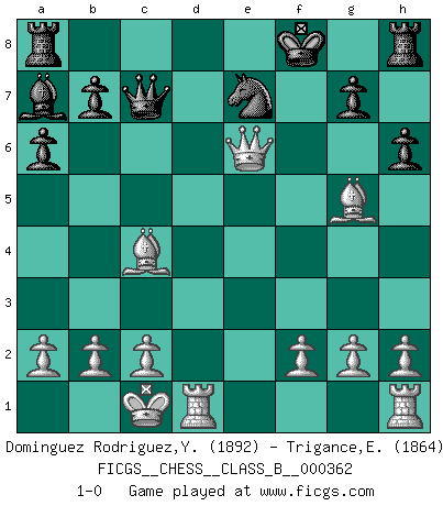 Last move : 1-0 2022 November 30 14:57:16 [Event "FICGS__CHESS__CLASS_B__000362"] [Site "FICGS"] [Date "2022.10.19"] [Round "1"] [White "Dominguez Rodriguez,Yosvany"] [Black "Trigance,Emile"] [Result "1-0"] [WhiteElo "1892"] [BlackElo "1864"] 1.e4 a6 2.d4 e6 3.Bd3 d5 4.Nc3 c5 5.dxc5 Bxc5 6.exd5 exd5 7.Nxd5 Ba7 8.Qe2+ Ne7 9.Bg5 Nbc6 10.Nxe7 Nxe7 11.O-O-O Qc7 12.Nh3 Be6 13.Nf4 h6 14.Nxe6 fxe6 15.Qxe6 Kf8 16.Bc4 1-0 Follow this game move after move (download)Many have become Chess Masters, no one has become the Master of Chess. (Siegbert Tarrasch) Pläne sind die Träume des Verständigen. (Ernst Freiherr von Feuchtersleben) La batalla por la última verdad nunca sera ganada. Y es por eso que el Ajedrez es tan fascinante. (Hans Kmoch) Les échecs c'est le défi de l'alpiniste, toujours plus haut, prêt à tout pour monter à l'assaut du Roi ennemi. Les échecs, c'est de la musique en mouvement, un ballet majestueux pour les yeux. C'est de la poésie composée par les fantômes du passé qui au même titre que Rimbaud ou Verlaine méritent notre admiration. Les échecs, c'est de la peinture ou le moindre mouvement modifie le tableau pour en faire un Picasso ou un Van Gogh. Les échecs, c'est tout et rien, c'est la vie et la mort. Jjulie33 sur le forum de France-Echecs. There are lots of people who mistake their imagination for their memory. (Josh Bilings)