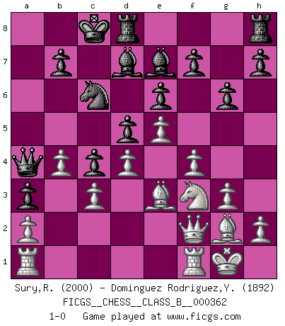 Last move : 1-0 2023 February 24 12:48:51 [Event "FICGS__CHESS__CLASS_B__000362"] [Site "FICGS"] [Date "2022.10.19"] [Round "1"] [White "Sury,Radim"] [Black "Dominguez Rodriguez,Yosvany"] [Result "1-0"] [WhiteElo "2000"] [BlackElo "1892"] 1.e4 e6 2.d4 d5 3.Nc3 Nf6 4.e5 Nfd7 5.f4 c5 6.Nf3 Nc6 7.Be3 a6 8.Ne2 Qb6 9.Qc1 Be7 10.g3 a5 11.Bg2 Qa6 12.Qd1 a4 13.O-O Nb6 14.Bf2 Nc4 15.b3 Nb2 16.Qc1 a3 17.Nc3 Qa5 18.Nd1 c4 19.Be1 Qa7 20.c3 Bd7 21.b4 Nd3 22.Qe3 Qa4 23.Bd2 g6 24.Nf2 Nxf2 25.Qxf2 O-O-O 26.Be3 1-0 This chess game has been lost on time (started : 2022.10.19 3:24:6) Follow this game move after move (download)Botvinnik tried to take the mystery out of Chess, always relating it to situations in ordinary life. He used to call Chess a typical inexact problem similar to those which people are always having to solve in everyday life. (Garry Kasparov) Deine Wertungszahl - vorausgesetzt einige Jahre schachliche Anstrengung - entspricht etwa dem zehnfachen Deines IQ plus 1000. (Jonathan Levitt) Hoy en día, si tu no eres un Gran Maestro a los 14 años, es mejor que lo olvides. (Anand Viswanathan) La vie et les Echecs sont tous les deux une lutte constante. (Lasker) God, you are such an idiot. - Actually, I thought I was more of a jerk. (Gregory House to Stacy Warner, House M.D.)