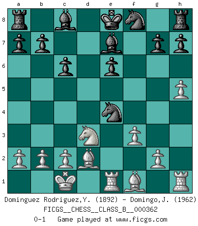 Last move : 0-1 2023 March 6 12:21:15 [Event "FICGS__CHESS__CLASS_B__000362"] [Site "FICGS"] [Date "2022.10.19"] [Round "1"] [White "Dominguez Rodriguez,Yosvany"] [Black "Domingo,Jordi"] [Result "0-1"] [WhiteElo "1892"] [BlackElo "1962"] 1.e4 e5 2.Nf3 f5 3.Nc3 fxe4 4.Nxe5 Qf6 5.d4 exd3 6.Nxd3 c6 7.Qe2+ Qe6 8.Qxe6+ dxe6 9.Bd2 Nd7 10.O-O-O Be7 11.Re1 Nf8 12.h4 Nh6 13.Ne4 Ng4 14.f3 Nf6 15.h5 Nxe4 0-1 This chess game has been lost on time (started : 2022.10.19 3:24:6) Follow this game move after move (download)In Chess, at least, the brave inherit the earth. (Edmar Mednis) Ein bischen Romantik kann weder im Schach noch in der Liebe schaden. Also versuche ich mich ab und zu daran zu erinnern. (Nigel Short) Alekhine es un poeta que crea un trabajo de arte de algo que raramente inspiraría a otra persona a mandar una tarjeta postal. (Max Euwe) Ce qui caractérise les parties de combat, c'est que si le défenseur a constamment de difficiles problèmes à résoudre, l'attaquant doit chercher sans relâche de nouvelles possibilités d'attaque. (Koblentz) History is a gallery of pictures in which there are few originals and many copies. (Alexis de Tocqueville)