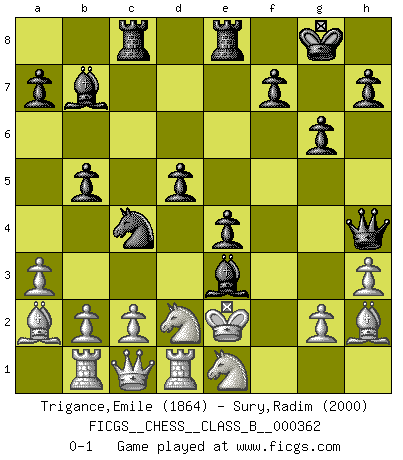 Last move : 0-1 2022 November 9 14:7:15 [Event "FICGS__CHESS__CLASS_B__000362"] [Site "FICGS"] [Date "2022.10.19"] [Round "1"] [White "Trigance,Emile"] [Black "Sury,Radim"] [Result "0-1"] [WhiteElo "1864"] [BlackElo "2000"] 1.a3 Nf6 2.d4 g6 3.h3 Bg7 4.Nf3 O-O 5.Bf4 c5 6.e3 d6 7.dxc5 Ne4 8.Qc1 Nxc5 9.Bc4 b5 10.Ba2 Nbd7 11.O-O Bb7 12.Nbd2 Rc8 13.Ne1 e5 14.Bg3 d5 15.Rb1 Nb6 16.Nb3 Ne4 17.Bh2 Nc4 18.Nf3 Re8 19.Rd1 Bh6 20.Nbd2 Nxf2 21.Kxf2 Bxe3+ 22.Ke2 e4 23.Ne1 Qh4 0-1 Follow this game move after move (download)Chess is a matter of delicate judgment, knowing when to punch and how to duck. (Bobby Fischer) Bis zum Jahr 1971 verlief in meiner Schachkariere alles glatt. Dieses dramatische Match [Fischer-Taimanov 6:0] machte mein Leben zur Hölle. (Mark Taimanov) Bobby Fischer es el jugador de Ajedrez mas grande que jamás haya existido. (Ken Smith) Je fais ceci parce que dans cinquante coups j'obtiendrai cela; je m'appelle Mikhail Moisevitch Botvinnik. (Botvinnik) A mistake is only a mistake if you let it happen twice. Otherwise it is a learning experience. (Daniel Parmet)