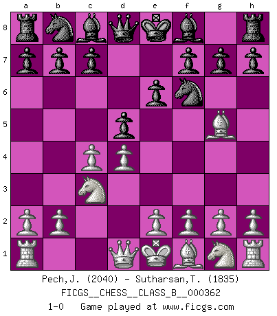 Last move : 1-0 2022 December 25 2:39:38 [Event "FICGS__CHESS__CLASS_B__000362"] [Site "FICGS"] [Date "2022.10.19"] [Round "1"] [White "Pech,Jaroslav"] [Black "Sutharsan,Thirunathan"] [Result "1-0"] [WhiteElo "2040"] [BlackElo "1835"] 1.c4 Nf6 2.Nc3 e6 3.d4 d5 4.Bg5 1-0 This chess game has been lost on time (started : 2022.10.19 3:24:6) Follow this game move after move (download)What would Chess be without silly mistakes ? (Kurt Richter) Ich verstehe mehr vom Schach als irgendein anderer lebender Meister. (José Raúl Capablanca) Robert Fischer es la ley hacia si mismo. (Larry Evans) Les pièces de l'échiquier étaient impitoyables. Elles le retenaient, elles l'absorbaient. Il y avait de l'horreur en cela, mais aussi une harmonie unique. Car, qu'y a-t-il dans le monde, à part les échecs ? (V. Nabokov) If everyone is thinking alike, then somebody isn't thinking. (US General George S. Patton)