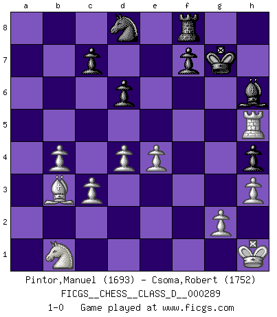 Last move : 1-0 2023 January 1 16:6:43 [Event "FICGS__CHESS__CLASS_D__000289"] [Site "FICGS"] [Date "2022.10.19"] [Round "1"] [White "Pintor,Manuel"] [Black "Csoma,Robert"] [Result "1-0"] [WhiteElo "1693"] [BlackElo "1752"] 1.e4 d6 2.f4 e5 3.Nf3 Bg4 4.Bc4 Nc6 5.c3 Nf6 6.d3 Be7 7.O-O O-O 8.Qe1 a6 9.a4 Rb8 10.h3 Bxf3 11.Rxf3 b5 12.axb5 axb5 13.Bb3 Ra8 14.Rxa8 Qxa8 15.Rg3 Nh5 16.Rg4 Nf6 17.Rg3 Na5 18.Bc2 Nh5 19.Rf3 Nxf4 20.Bxf4 exf4 21.Rxf4 Nb7 22.b4 Qa2 23.Qd1 Qe6 24.Bb3 Qh6 25.Qf3 Qg6 26.d4 Bg5 27.Rg4 h5 28.Rg3 Qh6 29.Qf5 Be3+ 30.Kh1 Qf4 31.Rf3 Qxf5 32.Rxf5 g6 33.Rf3 Bg5 34.Rg3 Bh6 35.Rxg6+ Kh7 36.Rf6 Kg7 37.Rf5 h4 38.Rxb5 Nd8 39.Rh5 1-0 Follow this game move after move (download)I thought the most common mistake [in chess] was the first one: Learning the game :P (Garvin Gray, FICGS forum) Wie, soll nun auch die Opposition abgeschafft werden? Ja, es tut mir leid, Ihnen diesen Schmerz nicht ersparen zu können. (Aaron Nimzowitsch) No hay precio que sea tan grande por la cabellera del Rey enemigo. (Koblentz) A chaque perte on perd un peu de soi. (Joël Lautier) Don't anthropomorphize computers - they hate it. (Anonymous)