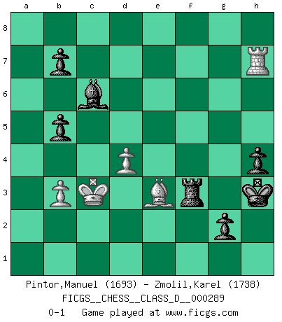 Last move : 0-1 2022 November 9 18:23:56 [Event "FICGS__CHESS__CLASS_D__000289"] [Site "FICGS"] [Date "2022.10.19"] [Round "1"] [White "Pintor,Manuel"] [Black "Zmolil,Karel"] [Result "0-1"] [WhiteElo "1693"] [BlackElo "1738"] 1.e4 d5 2.exd5 Qxd5 3.Nc3 Qd8 4.d4 e6 5.f4 Ne7 6.Nf3 Nd5 7.Nxd5 Qxd5 8.c3 Be7 9.Qb3 Qxb3 10.axb3 O-O 11.Bd3 Nc6 12.O-O a6 13.Ng5 h6 14.Nh3 Bd6 15.Nf2 f5 16.g4 Bd7 17.h4 fxg4 18.Nxg4 Be7 19.h5 Bh4 20.Be3 Ne7 21.Ne5 Be8 22.Kg2 Nf5 23.Bxf5 Rxf5 24.Ng6 Rxh5 25.f5 exf5 26.Nxh4 Rxh4 27.Rxf5 Bg6 28.Rf4 Rxf4 29.Bxf4 c6 30.Kf3 Bf5 31.b4 Rf8 32.Ke3 g5 33.Be5 Kh7 34.c4 Be6 35.b3 Kg6 36.Rd1 Rd8 37.Rf1 Bf5 38.Kd2 h5 39.Kc3 h4 40.Ra1 g4 41.b5 axb5 42.cxb5 cxb5 43.Ra7 Be4 44.Ra5 Bc6 45.Ra1 g3 46.Rf1 g2 47.Rf6+ Kg5 48.Rf7 Rg8 49.Bh2 Kg4 50.Bg1 Kg3 51.Rh7 Rf8 52.Rg7+ Kh3 53.Rh7 Rf1 54.Be3 Rf3 0-1 Follow this game move after move (download)A strong memory, concentration, imagination, and a strong will is required to become a great Chess player. (Bobby Fischer) Ich bewundere Kasparows phantasievolle Angriffssiege aus den Achtzigern und Neunzigern, aber wenn man sie mit dem Computer überprüft, nimmt der Computer in jeder zweiten Partie die Opfer an, verteidigt sich und gewinnt. (Vladimir Kramnik) El Rey es una pieza de pelea. ¡Usenlo!. (Wilhelm Steinitz) Les Echecs mettent en conflit, non pas deux intelligences, mais deux volontés. (Lasker) Cactus - It is depressed cucumber. (Ilmars Cirulis)