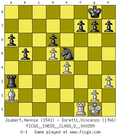 Last move : 0-1 2022 December 22 9:56:15 [Event "FICGS__CHESS__CLASS_D__000289"] [Site "FICGS"] [Date "2022.10.19"] [Round "1"] [White "Joubert,Hennie"] [Black "Soretti,Vincenzo"] [Result "0-1"] [WhiteElo "1541"] [BlackElo "1766"] 1.e4 c5 2.Nf3 e6 3.d4 cxd4 4.Nxd4 a6 5.c4 Nf6 6.Nc3 Bb4 7.f3 O-O 8.Be2 d6 9.Bd2 Bc5 10.Be3 e5 11.Nc2 Bxe3 12.Nxe3 Qb6 13.Ned5 Nxd5 14.Nxd5 Qd8 15.O-O Be6 16.Rc1 Bxd5 17.cxd5 Nd7 18.f4 exf4 19.Rxf4 Ne5 20.Qd4 b5 21.b3 Rc8 22.Rcf1 Rc2 23.Bd3 Rxa2 24.Bb1 Ra3 25.Bc2 Qc7 26.Qd1 Rc8 27.R4f2 Ra2 28.Bb1 Rxf2 29.Rxf2 Qc1 30.Qxc1 Rxc1+ 31.Rf1 Rc3 32.Ba2 Rc2 33.Bb1 Rb2 34.h3 Rxb3 35.Ba2 Ra3 0-1 Follow this game move after move (download)Life is like a game of Chess, changing with each move. (Chinese proverb) Schach ist eine Sache der genauen Beurteilung, wann man zuschlagen und wann man sich ducken muss. (Robert James Fischer) El Ajedrez demanda una total concentración. (Bobby Fischer) Les échecs sont un jeu terrible. Si vous n'avez pas le centre, votre adversaire a une position plus libre. Par contre, si vous avez le centre, alors vous avez vraiment quelque chose pour laquelle vous inquiéter ! (Siegbert Tarrasch) Without enthusiasm, virtue functions not at all, and vice only poorly. (Mignon McLaughlin, The Neurotic's Notebook, 1960)