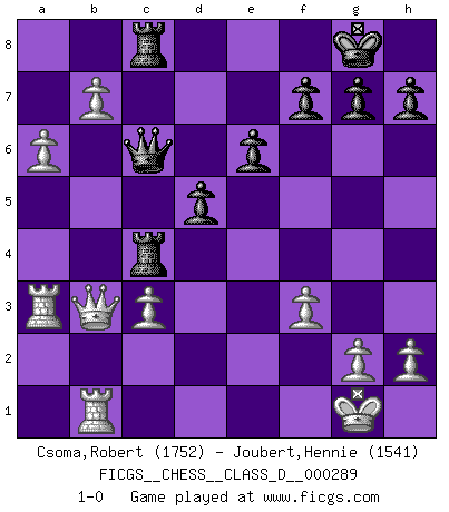 Last move : 1-0 2023 January 30 20:41:20 [Event "FICGS__CHESS__CLASS_D__000289"] [Site "FICGS"] [Date "2022.10.19"] [Round "1"] [White "Csoma,Robert"] [Black "Joubert,Hennie"] [Result "1-0"] [WhiteElo "1752"] [BlackElo "1541"] 1.e4 c5 2.Nf3 e6 3.d4 cxd4 4.Nxd4 Nf6 5.Bd3 Qb6 6.c3 Nc6 7.Nxc6 bxc6 8.O-O d5 9.exd5 cxd5 10.Nd2 Bc5 11.Nb3 Be7 12.Be3 Qc7 13.Qe2 Bb7 14.Bb5+ Bc6 15.Bxc6+ Qxc6 16.Nd4 Qc7 17.Nb5 Qc6 18.Nxa7 Qb7 19.Nb5 O-O 20.a4 Ne4 21.f3 Nf6 22.b4 Rfc8 23.Rfc1 Rc4 24.Na3 Rc6 25.b5 Rc7 26.Qd1 Bxa3 27.Rxa3 Rc4 28.Qb3 Nd7 29.a5 Nc5 30.Bxc5 Rxc5 31.Rb1 Rac8 32.b6 Rc4 33.a6 Qc6 34.b7 1-0 Follow this game move after move (download)Look at Garry Kasparov. After he loses, invariably he wins the next game. He just kills the next guy. That's something that we have to learn to be able to do. (Maurice Ashley) Wenn Du absolut nicht mehr weißt, was Du tun sollst, dann ist es Zeit für Panik. (John van der Wiel) Hoy en día, si tu no eres un Gran Maestro a los 14 años, es mejor que lo olvides. (Anand Viswanathan) C'est une question de caractère, Beaucoup de gens perdent leur motivation très vite. D'autres, ils sont rares, peuvent la conserver très longtemps. J'aime les échecs, encore aujourd'hui je suis heureux d'analyser des parties. J'aime toujours gagner, je déteste encore perdre. Bien jouer est important pour mon intégrité intellectuelle et morale. Et puis les échecs vivent en ce moment une période historique grâce à Internet. Ils se développent dans les systèmes éducatifs à travers le monde. Ils sortent de leur ghetto, et c'est mon rôle de mener à bien cette révolution. (Gary Kasparov) War is the child of passion, passion is the child of narcissism and narcissism is the child. (...) Another game ? (Thibault de Vassal)