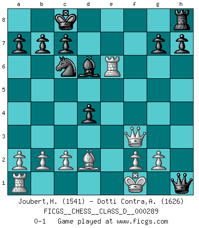 Last move : 0-1 2022 December 1 8:23:39 [Event "FICGS__CHESS__CLASS_D__000289"] [Site "FICGS"] [Date "2022.10.19"] [Round "1"] [White "Joubert,Hennie"] [Black "Dotti Contra,Alessandro"] [Result "0-1"] [WhiteElo "1541"] [BlackElo "1626"] 1.e4 e5 2.Bc4 Nf6 3.d4 exd4 4.Nf3 Nc6 5.O-O Nxe4 6.Re1 d5 7.Bxd5 Qxd5 8.Nc3 Qh5 9.Nxe4 Be6 10.Neg5 O-O-O 11.Nxe6 fxe6 12.Rxe6 Bd6 13.Bg5 Rdf8 14.Bd2 Rxf3 15.Qxf3 Qxh2+ 16.Kf1 Qh1+ 0-1 Follow this game move after move (download)Chess is life. (Bobby Fischer) Woher wissen wir, daß der Neanderthaler Blindschach gespielt hat? -- Bei Ausgrabungen wurden keine Schachbretter und Figuren gefunden. (Anonymous) Aquellos que dicen que entienden al Ajedrez, no entienden nada. (Robert Hubner) Si je n'étais pas joueur d'échecs, je serais le meilleur dans quelque chose d'autre. (Anatoli Karpov) I think your argument is specious - I think your tie is ugly. (Gregory House to Dr. Foreman, House M.D.)
