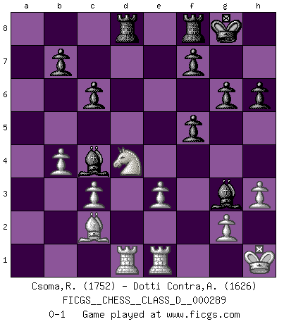 Last move : 0-1 2023 January 3 20:28:17 [Event "FICGS__CHESS__CLASS_D__000289"] [Site "FICGS"] [Date "2022.10.19"] [Round "1"] [White "Csoma,Robert"] [Black "Dotti Contra,Alessandro"] [Result "0-1"] [WhiteElo "1752"] [BlackElo "1626"] 1.d4 d5 2.Nc3 Nf6 3.Bg5 h6 4.Bxf6 exf6 5.e4 dxe4 6.Nxe4 Be7 7.Nf3 O-O 8.Be2 c6 9.O-O f5 10.Nc3 Be6 11.a3 Nd7 12.Ne5 Nxe5 13.dxe5 Qc7 14.Bd3 Qxe5 15.Re1 Qc7 16.Qf3 g6 17.Ne2 Bd6 18.h3 Bh2+ 19.Kh1 Be5 20.c3 Rad8 21.Rad1 a5 22.Bc2 Qb6 23.b4 axb4 24.axb4 Bd5 25.Qe3 Qxe3 26.fxe3 Bc4 27.Nd4 Bg3 0-1 Follow this game move after move (download)It is the aim of the modern school, not to treat every position according to one general law, but according to the principle inherent in the position. (Richard Reti) Im Leben werden Partien nie so unstrittig gewonnen wie im Spiel (Emanuel Lasker) A través de las casillas del tablero, los Indios explican el movimiento del tiempo y la edad, las influencias mas altas que controlan el mundo y los lazos que vinculan al Ajedrez con el alma humana. (Al-Masudi) La solitude du joueur d'Echecs à l'approche du mat est semblable à celle du condamné. (Francis Szpiner) Knowledge will give you power, but character respect. (Bruce Lee)