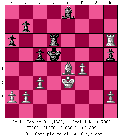 Last move : 1-0 2022 December 28 12:52:30 [Event "FICGS__CHESS__CLASS_D__000289"] [Site "FICGS"] [Date "2022.10.19"] [Round "1"] [White "Dotti Contra,Alessandro"] [Black "Zmolil,Karel"] [Result "1-0"] [WhiteElo "1626"] [BlackElo "1738"] 1.e4 e5 2.Nf3 Nc6 3.Bc4 h6 4.O-O Nf6 5.Nc3 a6 6.d4 exd4 7.Nxd4 Nxd4 8.Qxd4 d6 9.Bf4 Be7 10.Rad1 O-O 11.e5 dxe5 12.Qxe5 Bd6 13.Qd4 Be7 14.Qe3 Bd7 15.Nd5 Nxd5 16.Bxd5 c6 17.Bb3 Bf6 18.c3 Qc8 19.Qg3 Kh8 20.Bd6 Re8 21.Bxf7 Re4 22.f3 Bh4 23.Qg6 Re2 24.Bc4 Qe8 25.Qxe8+ R2xe8 26.g3 Bf6 27.Bf7 Rec8 28.Bc5 Be8 29.Be6 Rd8 30.Bb6 Rxd1 31.Rxd1 g5 32.Rd6 Kg7 33.Bd7 Bf7 34.Bf5 Be8 35.Kf2 h5 36.Bd4 Bxd4+ 37.Rxd4 Kf6 38.Bd3 c5 39.Rd6+ Ke5 40.Rh6 Rd8 41.Ke3 Rd6 42.f4+ gxf4+ 43.gxf4+ Kd5 44.Be4+ 1-0 Follow this game move after move (download)A bad plan is better than none at all. (Frank Marshall) Alles was am Schachbrett zählt sind gute Züge. (Robert James Fischer) Dios mío, Bobby Fischer juega tan simple. (Alexei Suetin) Les Echecs sont et restent toujours un combat, un combat intégral comme la boxe, la lutte ou un autre sport, et où il doit y avoir un vainqueur et un vaincu. (Joseph Emil Diemer) Question: Is 'This statement is paradoxical' a paradoxical statement ? Or is it a meta-paradox ? (Normajean Yates)