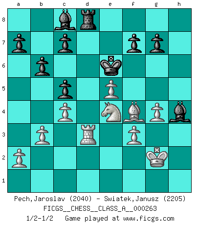 Last move : 1/2-1/2 2023 April 16 23:49:9 [Event "FICGS__CHESS__CLASS_A__000263"] [Site "FICGS"] [Date "2022.10.19"] [Round "1"] [White "Pech,Jaroslav"] [Black "Swiatek,Janusz"] [Result "1/2-1/2"] [WhiteElo "2040"] [BlackElo "2205"] 1.e4 e5 2.Nf3 Nc6 3.Bb5 Nf6 4.O-O Nxe4 5.d4 Nd6 6.Bxc6 dxc6 7.dxe5 Nf5 8.Qxd8+ Kxd8 9.h3 Bd7 10.Rd1 Be7 11.g4 Nh4 12.Nxh4 Bxh4 13.Nd2 Ke8 14.Ne4 h5 15.f3 Rd8 16.Kg2 Ke7 17.Bf4 b6 18.c4 Ke6 19.Ng5+ Ke7 20.Ne4 Ke6 21.Rd3 Bc8 22.Rad1 Rxd3 23.Rxd3 c5 24.b3 hxg4 25.hxg4 Rd8 1/2-1/2 Follow this game move after move (download)Nothing excites jaded Grandmasters more than a theoretical novelty. (Dominic Lawson) Im Blitz ist es einfacher mit einer Figur weniger anzugreifen, als sich mit einer Mehrfigur zu verteidigen. (Mikhail Nekhemyevich Tal) Aquel que ve no otra dirección en el juego que la de dar Jaque Mate a su oponente, nunca será un buen jugador de Ajedrez. (Euwe) Le pion, dans sa simplicité, marche droit devant lui, mais lorsqu'il prend, il le fait obliquement? Ainsi l'homme, tant qu'il reste pauvre, marche dans la droiture et vit honnêtement, mais lorsqu'il recherche les honneurs, il flatte, se parjure et, par les voies obliques, cherche une position supérieure sur l'échiquier du monde. (Jean de Galles) He is a liar. I just don't know what the lie is yet. (Horatio Caine, C.S.I. Miami)