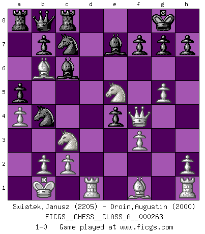 Last move : 1-0 2023 January 1 16:4:40 [Event "FICGS__CHESS__CLASS_A__000263"] [Site "FICGS"] [Date "2022.10.19"] [Round "1"] [White "Swiatek,Janusz"] [Black "Droin,Augustin"] [Result "1-0"] [WhiteElo "2205"] [BlackElo "2000"] 1.e4 c5 2.Nf3 d6 3.d4 cxd4 4.Nxd4 Nf6 5.Nc3 Bd7 6.f3 e5 7.Nb3 Be7 8.Be3 O-O 9.Qd2 a5 10.a4 Na6 11.O-O-O Qb8 12.g4 Rc8 13.Kb1 Nb4 14.g5 Ne8 15.Nc5 Bc6 16.Nd3 Nc7 17.Bb6 d5 18.Nxe5 dxe4 19.Qf4 1-0 Follow this game move after move (download)A thorough understanding of the typical mating continuations makes the most complicated sacrificial combinations leading up to them not only not difficult, but almost a matter of course. (Siegbert Tarrasch) Charakterschwächen offenbaren sich normalerweise während einer Schachpartie. (Garry Kasparov) Solo el jugador con la iniciativa tiene el derecho a atacar. (Wilhelm Steinitz) Ce qui caractérise les parties de combat, c'est que si le défenseur a constamment de difficiles problèmes à résoudre, l'attaquant doit chercher sans relâche de nouvelles possibilités d'attaque. (Koblentz) Industry executives and analysts often mistakenly talk about strategy as if it were some kind of chess match. But in chess, you have just two opponents, each with identical resources, and with luck playing a minimal role. The real world is much more like a poker game, with multiple players trying to make the best of whatever hand fortune has dealt them. In our industry, Bill Gates owns the table until someone proves otherwise. (David Moschella, 'Computerworld')