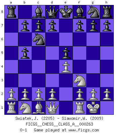 Last move : 0-1 2022 October 29 6:21:12 [Event "FICGS__CHESS__CLASS_A__000263"] [Site "FICGS"] [Date "2022.10.19"] [Round "1"] [White "Swiatek,Janusz"] [Black "Slawomir,Weglicki"] [Result "0-1"] [WhiteElo "2205"] [BlackElo "2009"] 1.e4 e5 2.Nf3 Nc6 3.Bb5 a6 4.O-O axb5 0-1 Follow this game move after move (download)Chess is a sea in which a gnat may drink and an elephant may bathe. (Hindu proverb) Über Frauen: Chess is better. (Robert James Fischer) Personalmente, yo prefiero mirar hacia el futuro en donde un programa de computadora gane el título mundial de Ajedrez. La humanidad necesita una lección de humildad. (Richard Dawkings) Il (Jacob Murray) ne joue pas pour le bon coup, mais pour le meilleur. (Eloi Relange) Being number two sucks. (Andre Agassi)