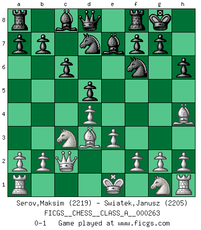 Last move : 0-1 2022 December 11 13:44:28 [Event "FICGS__CHESS__CLASS_A__000263"] [Site "FICGS"] [Date "2022.10.19"] [Round "1"] [White "Serov,Maksim"] [Black "Swiatek,Janusz"] [Result "0-1"] [WhiteElo "2219"] [BlackElo "2205"] 1.d4 d5 2.c4 e6 3.Nc3 Nf6 4.cxd5 exd5 5.Bg5 Be7 6.e3 h6 7.Bh4 c6 8.Qc2 O-O 9.Bd3 Nbd7 0-1 This chess game has been lost on time (started : 2022.10.19 19:28:6) Follow this game move after move (download)We don't really know how the game was invented, though there are suspicions. As soon as we discover the culprits, we'll let you know. (Bruce Pandolfini) Rauchen ist dem Schachspieler bei seiner Arbeit, also im Wettkampf, untersagt. (Viktor Kortschnoi) Ciertamente el estado mental actual de Bobby Fischer es una tragedia. Uno de los mas grandes jugadores de Ajedrez del mundo -el orgullo y pena del Ajedrez Americano. (Frank Brady) Un millionnaire : 'Monsieur Steinitz ! Vous ne participez aux tournois que pour l'argent, alors que moi je n'y viens que pour l'honneur.' Steinitz : 'Chacun joue pour ce qu'il n'a pas'... You must have a dream in order to have it come true. (A.P.J. Kalam)