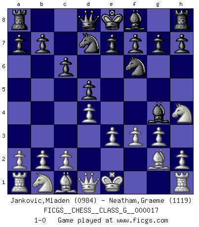 Last move : 1-0 2007 October 13 6:33:43 [Event "FICGS__CHESS__CLASS_G__000017"] [Site "FICGS"] [Date "2007.08.12"] [Round "1"] [White "Jankovic,Mladen"] [Black "Neatham,Graeme"] [Result "1-0"] [WhiteElo "0984"] [BlackElo "1119"] 1.d4 c6 2.e3 d5 3.g3 Nf6 4.Bg2 Bf5 5.Nf3 Nbd7 6.Nh4 Bg4 7.f3 1-0 This chess game has been lost on time (started : 2007.08.12 23:39:2) Queen's pawn Player White won this chess game. Follow this game move after move (download)Many Chess players were surprised when after the game, Fischer quietly explained: 'I had already analyzed this possibility' in a position which I thought was not possible to foresee from the opening. (Mikhail Tal) Kleine Schachspieler machen Mist, und große Schachspieler machen Mist, aber große machen weniger Mist. (Fritz Sämisch) El Ajedrez es 99 por ciento táctica. (Teichmann) Le jeu d'échecs est comme rejeté hors du temps. (Antoine de Saint-Exupéry) Secret operations are essential in war; upon them the army relies to make its every move. (Sun Tzu)