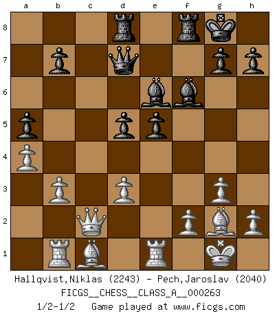 Last move : 1/2-1/2 2023 June 6 0:2:8 [Event "FICGS__CHESS__CLASS_A__000263"] [Site "FICGS"] [Date "2022.10.19"] [Round "1"] [White "Hallqvist,Niklas"] [Black "Pech,Jaroslav"] [Result "1/2-1/2"] [WhiteElo "2243"] [BlackElo "2040"] 1.c4 e5 2.g3 Nf6 3.Bg2 d5 4.cxd5 Nxd5 5.Nf3 Nc6 6.O-O Nb6 7.b3 Be7 8.Bb2 f6 9.Nc3 O-O 10.Qc1 Be6 11.Rd1 f5 12.d3 Bf6 13.Rb1 Nd4 14.e3 Nxf3+ 15.Bxf3 c6 16.Qc2 Qe7 17.a4 a5 18.e4 Rad8 19.exf5 Bxf5 20.Be4 Be6 21.Bc1 Nd5 22.Nxd5 cxd5 23.Bg2 Qd7 24.Re1 1/2-1/2 Follow this game move after move (download)Morphy was probably the greatest genius of them all. (Bobby Fischer) Im Reiche der Wirklichkeit ist man nie so glücklich wie im Reiche der Gedanken. (Arthur Schopenhauer) Hoy en día, si tu no eres un Gran Maestro a los 14 años, es mejor que lo olvides. (Anand Viswanathan) On croit qu'il y a plus de mauvais joueurs que de bons joueurs, c'est faux : Il y a autant de joueurs qui gagnent que de joueurs qui perdent. (Philippe Geluck) Secret operations are essential in war; upon them the army relies to make its every move. (Sun Tzu)