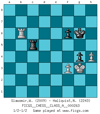 Last move : 1/2-1/2 2023 March 15 12:16:48 [Event "FICGS__CHESS__CLASS_A__000263"] [Site "FICGS"] [Date "2022.10.19"] [Round "1"] [White "Slawomir,Weglicki"] [Black "Hallqvist,Niklas"] [Result "1/2-1/2"] [WhiteElo "2009"] [BlackElo "2243"] 1.d4 e6 2.c4 b6 3.e4 Bb4+ 4.Bd2 Bxd2+ 5.Qxd2 d5 6.Bd3 Nc6 7.cxd5 exd5 8.Nf3 Nge7 9.exd5 Nxd5 10.O-O O-O 11.Nc3 Nce7 12.Rfe1 Bb7 13.Ne5 Ng6 14.Rad1 Re8 15.Bc4 Re7 16.Qc2 Nxc3 17.bxc3 Qe8 18.Qd2 Nxe5 19.dxe5 Qc6 20.Qg5 h6 21.Qg4 b5 22.Bd5 Qb6 23.Bb3 Rae8 24.e6 Kh8 25.Re3 Bc8 26.exf7 Rxe3 27.fxe8R+ Rxe8 28.Qf3 Qf6 29.Qxf6 gxf6 30.c4 Be6 31.Re1 b4 32.Ba4 c6 33.Bxc6 Rd8 34.Bb5 Rd2 35.h4 Bg8 36.Re8 Rxa2 37.c5 Rc2 38.Ba4 Rc1+ 39.Kh2 Kg7 40.Re7+ Kf8 41.Rxa7 b3 42.Rb7 Rxc5 43.Bxb3 Bxb3 44.Rxb3 Kf7 45.g4 h5 46.f3 Kg6 47.Kg3 Rd5 48.Rb4 Rc5 49.Rb6 hxg4 1/2-1/2 Follow this game move after move (download)After a bad opening, there is hope for the middle game. After a bad middle game, there is hope for the endgame. But once you are in the endgame, the moment of truth has arrived. (Edmar Mednis) Die westlichen Werte sind eine Sprache, welche die Putin-Administration nicht versteht. (Garry Kasparov) Los Peones son el alma de una partida de Ajedrez. (Francois Andre Danican Philidor) Plusieurs personnes se sont demandées comment Tal faisait pour gagner... En fait, c'est très simple ! Il met ses pièces au centre de l'échiquier et les sacrifie quelque part ! (David Bronstein) Memory... is the diary that we all carry with us. (Oscar Wilde, The Importance of Being Earnest)