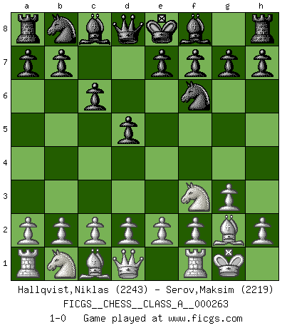 Last move : 1-0 2022 December 22 6:49:32 [Event "FICGS__CHESS__CLASS_A__000263"] [Site "FICGS"] [Date "2022.10.19"] [Round "1"] [White "Hallqvist,Niklas"] [Black "Serov,Maksim"] [Result "1-0"] [WhiteElo "2243"] [BlackElo "2219"] 1.Nf3 d5 2.g3 Nf6 3.Bg2 c6 4.O-O 1-0 This chess game has been lost on time (started : 2022.10.19 19:28:6) Follow this game move after move (download)The most powerful weapon in Chess is to have the next move. (David Bronstein) Ich bin es gewohnt, das die Jugend mir überhaupt keinen Respekt entgegenbringt. (Alexander Morozewich) El tablero es el mundo, las piezas es el fenomeno del universo, las reglas del juego son lo que llamamos leyes de la naturaleza y el jugador del lado opuesto, se encuentra oculto a nuestra vista. (Thomas Huxley) Même si vous avez un bon coup à faire, regardez toujours s'il n'y en a pas un qui lui soit préférable. (Pedro Damiano) Animated gif is worth one mega-word. (Unknown)