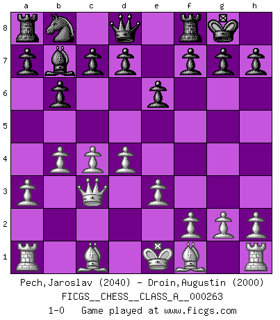 Last move : 1-0 2023 January 12 3:9:39 [Event "FICGS__CHESS__CLASS_A__000263"] [Site "FICGS"] [Date "2022.10.19"] [Round "1"] [White "Pech,Jaroslav"] [Black "Droin,Augustin"] [Result "1-0"] [WhiteElo "2040"] [BlackElo "2000"] 1.d4 Nf6 2.c4 e6 3.Nc3 Bb4 4.e3 b6 5.Nge2 Ne4 6.Qc2 Bb7 7.a3 Bxc3+ 8.Nxc3 Nxc3 9.Qxc3 O-O 10.b4 1-0 This chess game has been lost on time (started : 2022.10.19 19:28:6) Follow this game move after move (download)Chess is mental torture. (Garry Kasparov) Ich verstehe Aljechins Kombinationen ganz gut; aber woher er diese Angriffschancen bekommt und wie er die Eröffnung behandelt das ist für mich ein Buch mit sieben Siegeln. (Rudolf Spielmann) El jugador blanco perdió porque fallo en recordar la coreccta continuación y tuvo que pensar por sí mismo las movidas. (Siegbert Tarrasch) Le plus grand jeu de l'esprit jamais inventé, plus vous l'apprenez, plus vous y prenez du plaisir. (Garry Kasparov) Those who make the worst use of their time are the first to complain of its brevity. (Jean de la Bruyere)