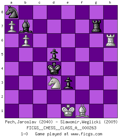 Last move : 1-0 2023 December 17 0:8:48 [Event "FICGS__CHESS__CLASS_A__000263"] [Site "FICGS"] [Date "2022.10.19"] [Round "1"] [White "Pech,Jaroslav"] [Black "Slawomir,Weglicki"] [Result "1-0"] [WhiteElo "2040"] [BlackElo "2009"] 1.c4 e5 2.Nc3 Bb4 3.Nd5 a5 4.a3 Be7 5.d4 d6 6.Nf3 e4 7.Nd2 f5 8.Nb1 c6 9.Nxe7 Nxe7 10.Nc3 O-O 11.f4 d5 12.b3 Be6 13.e3 Nd7 14.a4 Nf6 15.Be2 Qe8 16.Rb1 Qd7 17.O-O h6 18.Bd2 b6 19.Bc1 Kh7 20.Ba3 Rg8 21.c5 bxc5 22.Bxc5 g5 23.g3 h5 24.Qe1 gxf4 25.Bxe7 Qxe7 26.Rxf4 Qb4 27.Qc1 Bd7 28.Na2 Qe7 29.Qc3 Kg7 30.Rbf1 Rh8 31.Nc1 Qb4 32.Qxb4 axb4 33.Na2 Kg6 34.Rc1 Rab8 35.h3 h4 36.gxh4 Ne8 37.Rcf1 Ng7 38.Kh2 Be6 39.Rc1 Bd7 40.Rcf1 Kf6 41.h5 Be8 42.Bg4 Bd7 43.Bd1 Be8 44.Bg4 Bd7 45.Be2 Nxh5 46.Rh4 Ng7 47.Rxh8 Rxh8 48.a5 Ne6 49.a6 Nc7 50.Kg3 Rg8+ 51.Kh2 Rh8 52.Kg3 Rb8 53.Ra1 Rg8+ 54.Kf2 f4 55.exf4 Bxh3 56.Nxb4 Kf5 57.Rh1 Rg2+ 58.Ke1 Rg3 59.Bd1 Kxf4 60.a7 Ke3 61.Nxc6 Be6 62.Nb4 Rg2 63.Nc2+ Kd3 64.b4 Rg7 65.b5 Na8 66.Rh6 Bd7 67.b6 e3 68.Nb4+ Kxd4 69.Be2 Bc8 70.Bf1 Bb7 71.Nd3 1-0 Follow this game move after move (download)Chess demands total concentration. (Bobby Fischer) Wenn du gegen Bobby spielst, ist es keine Frage von gewinnen oder verlieren. Es ist eine Frage des Überlebens. (Boris Vassilievich Spassky) Un mal plan es mejor que no tener ningún plan. (Frank Marshall) Les échecs sont utiles à l'exercice de la faculté de penser et à celle de l'imagination. Car nous devons posséder une méthode élaborée pour atteindre des buts partout où nous devons conduire notre raison. (Leibnitz) Always be a first-rate version of yourself, instead of a second-rate version of somebody else. (Judy Garland)