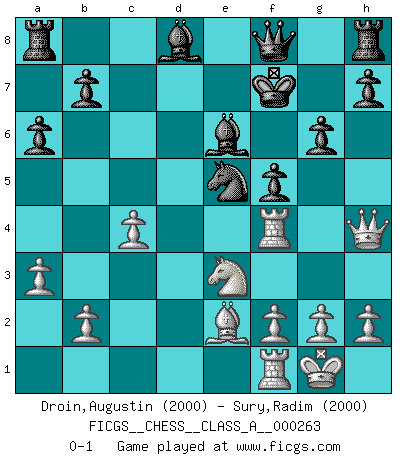 Last move : 0-1 2022 November 22 10:53:45 [Event "FICGS__CHESS__CLASS_A__000263"] [Site "FICGS"] [Date "2022.10.19"] [Round "1"] [White "Droin,Augustin"] [Black "Sury,Radim"] [Result "0-1"] [WhiteElo "2000"] [BlackElo "2000"] 1.e4 c5 2.Nf3 d6 3.d4 cxd4 4.Nxd4 Nf6 5.Nc3 a6 6.a3 e5 7.Nf5 d5 8.Bg5 d4 9.Bxf6 Qxf6 10.Nd5 Qc6 11.c4 g6 12.Nxd4 exd4 13.Qxd4 f6 14.Rd1 Bc5 15.Qd2 Be7 16.Qh6 Kf7 17.Be2 Bd8 18.e5 Nd7 19.O-O Nxe5 20.Rd4 Qc5 21.Rf4 Be6 22.Ne3 Qf8 23.Qh4 f5 0-1 Follow this game move after move (download)Pawns: they are the soul of this game, they alone form the attack and defense. (Philidor) Es liegt in der Natur, vernüftig zu denken und unlogisch zu handeln. (Anatole France) En la vida, como en el Ajedrez, los Peones propios obstruyen nuestro camino. La gran fortuna de un hombre, su comodidad, placer, hijos, libros, que deberían ayudarle a ganar, con mucha frecuencia lo ponen en Jaque Mate. (Charles Buxton) La tactique est l'élément le plus important du milieu de jeu. (Siegbert Tarrasch) What doesn't kill us makes us stronger. (Friedrich Nietzsche)
