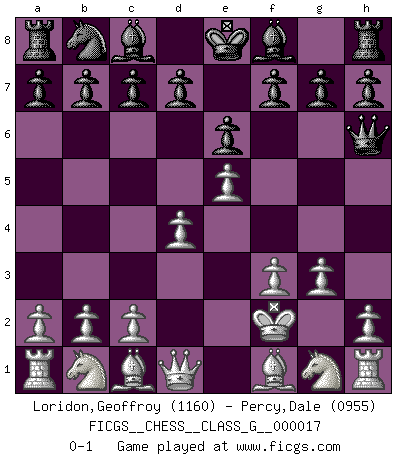 Last move : 0-1 2007 September 28 16:21:50 [Event "FICGS__CHESS__CLASS_G__000017"] [Site "FICGS"] [Date "2007.08.12"] [Round "1"] [White "Loridon,Geoffroy"] [Black "Percy,Dale"] [Result "0-1"] [WhiteElo "1160"] [BlackElo "0955"] 1.d4 e6 2.e4 Nf6 3.e5 Ne4 4.f3 Nf2 5.Kxf2 Qh4+ 6.g3 Qh6 0-1 This chess game has been lost on time (started : 2007.08.12 23:39:2) Queen's pawn Player Black won this chess game. Follow this game move after move (download)Every Chess master was once a beginner. (Chernev) Vielleicht wirkt die Aura früherer Spieler glanzvoller als die der heutigen Spieler, aber das liegt daran, dass man kein Programm wie Fritz hatte, das einem all die Löcher in ihren Partien zeigt. (Vladimir Kramnik) El Ajedrez es realmente noventa y nueve por ciento calculación. (Soltis) On peut tirer plus d'utilité d'une partie perdue que de 100 parties gagnées. (Capablanca) Mandala - that's it! 16x16 squares as multiple of the four and the eight because of the Four Noble Truths and the Noble Eightfold Path. (Heinz-Georg Lehnhoff about Big Chess)