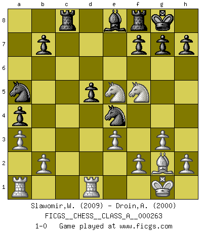 Last move : 1-0 2022 November 21 17:42:49 [Event "FICGS__CHESS__CLASS_A__000263"] [Site "FICGS"] [Date "2022.10.19"] [Round "1"] [White "Slawomir,Weglicki"] [Black "Droin,Augustin"] [Result "1-0"] [WhiteElo "2009"] [BlackElo "2000"] 1.d4 Nf6 2.c4 e6 3.Nf3 Bb4+ 4.Bd2 a5 5.g3 d5 6.Qc2 O-O 7.Bg2 c5 8.cxd5 cxd4 9.Nxd4 Qb6 10.e3 exd5 11.a3 Bxd2+ 12.Nxd2 Nc6 13.N2f3 Bd7 14.O-O Rac8 15.Qb3 Qxb3 16.Nxb3 Ne4 17.Rfd1 a4 18.Nbd4 Na5 19.Ne5 Be8 20.Nf5 1-0 Follow this game move after move (download)After a bad opening, there is hope for the middle game. After a bad middle game, there is hope for the endgame. But once you are in the endgame, the moment of truth has arrived. (Edmar Mednis) Zu meiner Zeit war ein 20 jähriger ein junger Spieler, heute ist er ein Veteran. (Garry Kasparov) El Ajedrez es un juego de pelea el cual es puramente intelectual e incluye la suerte. (Richard Reti) Le thème de l'attaque double intervient d'une manière ou d'une autre dans l'immense majorité des combinaisons. (Youri Averbakh) It's not the will to win, but the will to prepare to win that makes the difference. (Bear Bryant)