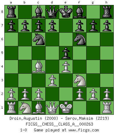 Last move : 1-0 2022 December 21 16:44:30 [Event "FICGS__CHESS__CLASS_A__000263"] [Site "FICGS"] [Date "2022.10.19"] [Round "1"] [White "Droin,Augustin"] [Black "Serov,Maksim"] [Result "1-0"] [WhiteElo "2000"] [BlackElo "2219"] 1.e4 e5 2.Nf3 Nc6 3.Bc4 Nf6 4.d3 1-0 This chess game has been lost on time (started : 2022.10.19 19:28:6) Follow this game move after move (download)Different people feel differently about resigning. (Bobby Fischer) Wie, soll nun auch die Opposition abgeschafft werden? Ja, es tut mir leid, Ihnen diesen Schmerz nicht ersparen zu können. (Aaron Nimzowitsch) El Ajedrez no es una pizca de inferior al violín, y tenemos un gran número de violinistas profesionales. (Mikhail Botvinnik) Le moment que je préfère le plus dans une rencontre, c'est celui où je sens que la personnalité de l'adversaire se brise. (Robert Fischer) Wawaweewa ! (Borat: Cultural learnings of America for make benefit glorious nation of Kazakhstan)