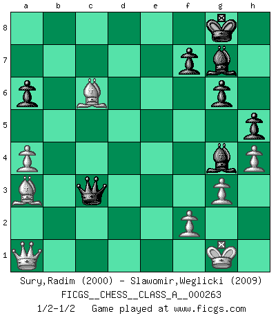 Last move : 1/2-1/2 2022 November 10 13:17:6 [Event "FICGS__CHESS__CLASS_A__000263"] [Site "FICGS"] [Date "2022.10.19"] [Round "1"] [White "Sury,Radim"] [Black "Slawomir,Weglicki"] [Result "1/2-1/2"] [WhiteElo "2000"] [BlackElo "2009"] 1.e4 e5 2.Nf3 Nc6 3.Bb5 a6 4.Ba4 Nf6 5.O-O Be7 6.Re1 b5 7.Bb3 d6 8.c3 O-O 9.h3 Nb8 10.d4 Nbd7 11.Nbd2 Bb7 12.Bc2 Re8 13.a4 Bf8 14.Bd3 c6 15.b3 h6 16.Qc2 Qc7 17.Ba3 Nh5 18.g3 Nhf6 19.Bf1 Rac8 20.Rad1 Rcd8 21.Bg2 g6 22.Ra1 Rc8 23.Rab1 h5 24.Ng5 Bh6 25.Ndf3 d5 26.dxe5 Nxe5 27.Nxe5 Rxe5 28.h4 Nxe4 29.Nxe4 dxe4 30.Rxe4 Rce8 31.Rbe1 Bc8 32.Qd1 Bg4 33.Rxe5 Rxe5 34.Qa1 Bg7 35.Rxe5 Qxe5 36.Bxc6 bxa4 37.bxa4 Qxc3 1/2-1/2 Follow this game move after move (download)The most important feature of the Chess position is the activity of the pieces. This is absolutely fundamental in all phases of the game: Opening, Middlegame and especially Endgame. The primary constraint on a piece's activity is the Pawn structure. (Michael Stean) Die Idee von Capablanca, Schach als Fach in den Schulen zu lehren, ist großartig. (Fidel Castro) Yo creo que el Ajedrez posee una magia que es también una ayuda en la edad avanzada. Una rodilla reumática es olvidada durante una partida de Ajedrez y otros eventos pueden parecer algo sin importancia comparada a una catástrofe en el tablero de Ajedrez. (Vlastimil Hort) Le temps de noter son nom sur la feuille de partie, j'étais déjà en zeitnot ! D'un modeste amateur apparié lors de la première ronde d'un open contre le grand-maître Azmaïparashvili. After growing wildly for years, the field of computing appears to be reaching its infancy. (John Pierce)