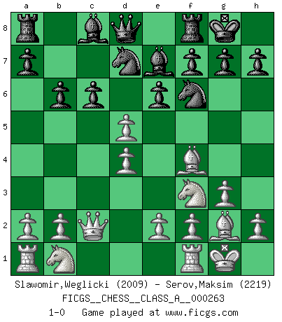 Last move : 1-0 2022 December 4 14:36:23 [Event "FICGS__CHESS__CLASS_A__000263"] [Site "FICGS"] [Date "2022.10.19"] [Round "1"] [White "Slawomir,Weglicki"] [Black "Serov,Maksim"] [Result "1-0"] [WhiteElo "2009"] [BlackElo "2219"] 1.d4 d5 2.c4 e6 3.Nf3 Nf6 4.g3 Bb4+ 5.Bd2 Be7 6.Qc2 O-O 7.Bg2 Nbd7 8.O-O c6 9.Bf4 b6 10.cxd5 1-0 This chess game has been lost on time (started : 2022.10.19 19:28:6) Follow this game move after move (download)With or without the title, Bobby Fischer was unquestionably the greatest player of his time. (Burt Hochberg) Schach ist eine Sache der genauen Beurteilung, wann man zuschlagen und wann man sich ducken muss. (Robert James Fischer) El Ajedrez lo es todo: arte, ciencia y deporte. (Anatoly Karpov) La tactique, c'est ce que vous faites quand il y a quelque chose à faire; la stratégie, c'est ce que vous faites quand il n'y a rien à faire. (Savielli Tartacower) Life is verb, not a noun. (Charlotte Perkins Gilman)