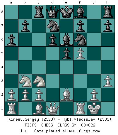 Last move : 1-0 2023 January 20 19:50:47 [Event "FICGS__CHESS__CLASS_SM__000026"] [Site "FICGS"] [Date "2022.10.23"] [Round "1"] [White "Kireev,Sergey"] [Black "Hybl,Vladislav"] [Result "1-0"] [WhiteElo "2328"] [BlackElo "2335"] 1.e4 c5 2.Nf3 d6 3.d4 cxd4 4.Nxd4 Nf6 5.Nc3 a6 6.h3 e5 7.Nb3 Be6 8.f4 g6 9.Be2 Nbd7 10.O-O Rc8 11.f5 gxf5 12.exf5 1-0 This chess game has been lost on time (started : 2022.10.23 16:12:58) Follow this game move after move (download)The sign of a great Master is his ability to win a won game quickly and painlessly. (Irving Chernev) Eine Person mit durchschnittlichem IQ kann etwa eine ELO von 2000 erreichen. (Jonathan Levitt) Siempre es mejor sacrificar los hombres de tu oponente. (Savielly Tartakower) Les échecs sont un jeu par leur forme, un art par leur essence et une science par sa difficulté d'acquisition. Ils peuvent vous procurer autant de plaisir qu'un bon livre ou une belle musique, mais vous n'aurez une réelle joie que si vous arrivez à bien jouer. (Tigran Petrosian) When you have everything, sometimes it feels like nothing. (Horatio Caine, C.S.I. Miami)