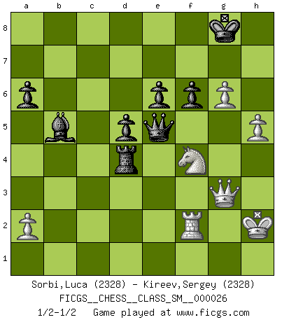 Last move : 1/2-1/2 2022 November 22 9:20:58 [Event "FICGS__CHESS__CLASS_SM__000026"] [Site "FICGS"] [Date "2022.10.23"] [Round "1"] [White "Sorbi,Luca"] [Black "Kireev,Sergey"] [Result "1/2-1/2"] [WhiteElo "2328"] [BlackElo "2328"] 1.e4 e6 2.d4 d5 3.Nc3 Nf6 4.e5 Nfd7 5.f4 c5 6.Nf3 cxd4 7.Nxd4 Nc6 8.Be3 Qb6 9.Qd2 Qxb2 10.Rb1 Qa3 11.Bb5 Nxd4 12.Bxd4 a6 13.Bxd7+ Bxd7 14.Rb3 Qe7 15.Rxb7 Rc8 16.O-O Qd8 17.Qe3 Rc4 18.Rfb1 Be7 19.f5 Bg5 20.Qd3 O-O 21.f6 Bc6 22.Re7 h6 23.g3 h5 24.h4 Bh6 25.Rb6 Qa8 26.Kh2 Rb8 27.Rb3 R8b4 28.Ne2 Bb5 29.Qf3 g6 30.c3 Ra4 31.Rb2 Bf8 32.g4 Bxe7 33.gxh5 Qf8 34.Nf4 Rxd4 35.cxd4 Rxd4 36.fxe7 Qxe7 37.Qg3 Qc7 38.hxg6 Qxe5 39.Rf2 f6 40.h5 1/2-1/2 Follow this game move after move (download)When you play Bobby, it is not a question if you win or lose. It is a question if you survive. (Boris Spassky) Wenn Capablanka heute auf der Schachbühne erscheinen würde, hätte er ein halbes Jahr gebraucht um sich die Schachtheorie anzueignen. Und dann hätte er alles und jeden besiegt. (Mikhail Moiseyevich Botvinik) Todos los jugadores de Ajedrez deberían tener un pasatiempo. (Savielly Tartakower) Mais l'homme est une créature légère et illogique : semblable au joueur d'échecs, il n'aime que le processus du but à atteindre, non le but lui-même. (Dostoïevsky) Before all elsed, be armed. (Niccolo Machiavelli)