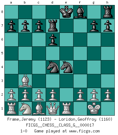 Last move : 1-0 2007 September 23 15:35:21 [Event "FICGS__CHESS__CLASS_G__000017"] [Site "FICGS"] [Date "2007.08.12"] [Round "1"] [White "Frame,Jeremy"] [Black "Loridon,Geoffroy"] [Result "1-0"] [WhiteElo "1123"] [BlackElo "1160"] 1.e4 e5 2.Nf3 Nc6 3.Bc4 Nd4 4.Nxe5 d6 5.Nxf7 Be6 6.Nxd8 Rxd8 7.Bxe6 Nf6 8.Bb3 Nxe4 9.O-O Rd7 10.Re1 1-0 This chess game has been lost on time (started : 2007.08.12 23:39:2) King's pawn game Kingside Castling by player White (move 9) Player White won this chess game. Follow this game move after move (download)In blitz, the Knight is stronger than the Bishop. (Vlastimil Hort) Ich war schon mal beim Dopingtest. Da musste ich Urin abgeben, während Dritte zusahen. (Elisabeth Pähtz) En el tablero, la mentira e hipocresía no sobreviven mucho. (Emanuel Lasker) Vous m'avez demandé de vous exposer quel est le fondement de la prière. Je ne fais que préparer les pièces du jeu sur la table... Nous sera-t-il permis d'en adopter les règles et si nous les appliquons scrupuleusement nous ne tarderons pas à faire mat le Roi divin ! Il ne pourra échapper à nos mains. (Sainte Thérèse d'Avila, Chemin de perfection) The obstacle is the path. (Zen proverb)