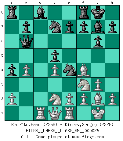 Last move : 0-1 2022 December 26 21:54:22 [Event "FICGS__CHESS__CLASS_SM__000026"] [Site "FICGS"] [Date "2022.10.23"] [Round "1"] [White "Renette,Hans"] [Black "Kireev,Sergey"] [Result "0-1"] [WhiteElo "2368"] [BlackElo "2328"] 1.d4 Nf6 2.Nf3 g6 3.g3 Bg7 4.Bg2 O-O 5.O-O d5 6.c3 a5 7.Bf4 Nbd7 8.Re1 a4 9.Nbd2 c5 10.b4 cxd4 11.cxd4 Ne4 12.Rc1 Qb6 0-1 Follow this game move after move (download)I'd rather have a Pawn than a finger. (Reuben Fine) Ein Gewinn durch eine ungenaue Kombination, sei sie auch noch so vorzeigbar, erfüllt mich mit Schaudern. (Wilhelm Steinitz) Observen a Garry Kasparov. Después de una derrota, invariablemente el gana la próxima partida. Prácticamente hace pedazos a su siguiente oponente. Eso es algo que tenemos que aprender a lograr. (Maurice Ashley) Le jeu d'échecs fait naître et fortifie en nous plusieurs qualités précieuses dans le cours de l'existence, telles que la prévoyance, la circonspection, la prudence, et la persévérance. (Benjamin Franklin - 1783, la morale des échecs) When you stop learning you start dying. (Scott Adams)