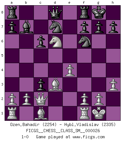 Last move : 1-0 2023 January 29 16:30:21 [Event "FICGS__CHESS__CLASS_SM__000026"] [Site "FICGS"] [Date "2022.10.23"] [Round "1"] [White "Ozen,Bahadir"] [Black "Hybl,Vladislav"] [Result "1-0"] [WhiteElo "2254"] [BlackElo "2335"] 1.d4 Nf6 2.c4 e6 3.Nf3 d5 4.Nc3 c6 5.e3 Nbd7 6.Qc2 Bd6 7.Bd3 dxc4 8.Bxc4 b5 9.Bd3 Bb7 10.e4 e5 11.O-O O-O 12.h3 exd4 13.Nxd4 b4 14.Nf5 bxc3 15.Nxd6 1-0 This chess game has been lost on time (started : 2022.10.23 16:12:58) Follow this game move after move (download)The older I grow, the more I value Pawns. (Keres) Die Jungen erwarten, dass Opa einfach umfällt. Dann aber kann Opa fünf Stunden lang Schach spielen und die jungen Gegner an die Wand drücken. (Viktor Kortschnoi) Los libros de Ajedrez deben de usarse igual como usamos los anteojos: para mejorar la vista, aunque algunos jugadores los quieren usar como si ellos les otorgaran la vision. (José Raúl Capablanca) A ce moment-là, je menaçais de comprendre la position ! (Clément L'Heureux) Just because you do not take an interest in politics doesn't mean politics won't take an interest in you. (Pericles 430 B.C.)