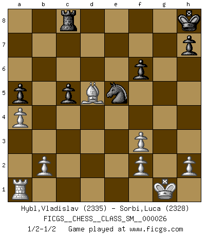 Last move : 1/2-1/2 2023 April 10 19:32:42 [Event "FICGS__CHESS__CLASS_SM__000026"] [Site "FICGS"] [Date "2022.10.23"] [Round "1"] [White "Hybl,Vladislav"] [Black "Sorbi,Luca"] [Result "1/2-1/2"] [WhiteElo "2335"] [BlackElo "2328"] 1.d4 Nf6 2.c4 e6 3.Nf3 d5 4.Nc3 Bb4 5.Qa4+ Nc6 6.e3 O-O 7.Qc2 Re8 8.Bd2 Bf8 9.Be2 b6 10.O-O Nb4 11.Qa4 dxc4 12.Bxc4 a6 13.Ne2 Bd7 14.Qb3 c5 15.dxc5 bxc5 16.Rfd1 a5 17.a4 Qb8 18.Nf4 Bd6 19.Bc3 Bc6 20.Bxf6 Bxf3 21.gxf3 Bxf4 22.exf4 gxf6 23.f5 Nc6 24.fxe6 fxe6 25.Bxe6+ Kh8 26.Rd7 Qxb3 27.Bxb3 Ne5 28.Rc7 Rec8 29.Rxc8+ Rxc8 30.Bd5 1/2-1/2 Follow this game move after move (download)I give 98 percent of my mental energy to Chess. Others give only 2 percent. (Bobby Fischer) Schach ist wie eine schöne Frau, zu der wir ständig zurückkehren, gleichviel, wie oft sie uns zurückweist. (Anonymous) Es muy difícil jugar en contra de la teoría de Einstein. - en su primera derrota en contra de Fischer (Mikhail Tal) Mais n'est-ce pas déjà le limiter injurieusement que d'appeler les échecs un jeu? N'est-ce pas aussi une science, un art, ou quelque chose qui, comme le cercueil de Mahomet entre ciel et terre, est suspendu entre l'un et l'autre, et qui réunit un nombre incroyable de contraires ? (Stefan Zweig) Vladimir Ras-Putin is still alive... He is also a good actor, I saw him in the Lord of the Rings. (Rodolfo d'Ettorre)
