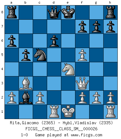 Last move : 1-0 2023 January 29 7:48:31 [Event "FICGS__CHESS__CLASS_SM__000026"] [Site "FICGS"] [Date "2022.10.23"] [Round "1"] [White "Rita,Giacomo"] [Black "Hybl,Vladislav"] [Result "1-0"] [WhiteElo "2365"] [BlackElo "2335"] 1.e4 c5 2.Nf3 d6 3.d4 cxd4 4.Nxd4 Nf6 5.Nc3 e5 6.Bb5+ Nbd7 7.Nf5 a6 8.Ba4 b5 9.Bb3 Nc5 10.Bg5 Bxf5 11.exf5 Be7 12.Bxf6 Bxf6 13.Qf3 e4 14.Nxe4 Bxb2 15.Rd1 1-0 This chess game has been lost on time (started : 2022.10.23 16:12:58) Follow this game move after move (download)Not only will I predict his triumph over Botvinnik, but I'll go further and say that he'll probably be the greatest Chess player that ever lived. (John Collins) Wer der Ansicht ist, daß alle Schachspieler verrückt sind, wird durch Studium des Lebens von Emil Josef Diemer nicht auf andere Gedanken kommen. (Hans Ree) En la vida, como en el Ajedrez, los Peones propios obstruyen nuestro camino. La gran fortuna de un hombre, su comodidad, placer, hijos, libros, que deberían ayudarle a ganar, con mucha frecuencia lo ponen en Jaque Mate. (Charles Buxton) Echiquier : carré parfait, comme la Jérusalem nouvelle décrite par l'auteur de l'Apocalypse, huit cases sur huit, exaltation du chiffre 4, symbole du cosmos aux quatre horizons... où le noir et le blanc, l'ombre et la lumière, le mal et le bien s'entremêlent et se conjuguent. (Robert Couffignal, Le Gambit du poète) God is an atheist. (Unknown)