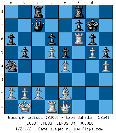 Last move : 1/2-1/2 2023 April 13 22:40:10 [Event "FICGS__CHESS__CLASS_SM__000026"] [Site "FICGS"] [Date "2022.10.23"] [Round "1"] [White "Wosch,Arkadiusz"] [Black "Ozen,Bahadir"] [Result "1/2-1/2"] [WhiteElo "2300"] [BlackElo "2254"] 1.e4 c5 2.Nf3 d6 3.d4 cxd4 4.Nxd4 Nf6 5.Nc3 a6 6.Be3 e5 7.Nb3 Be6 8.f3 h5 9.Nd5 Bxd5 10.exd5 g6 11.Qd2 Nbd7 12.O-O-O Nb6 13.Qa5 Bh6 14.Bxh6 Rxh6 15.Kb1 Kf8 16.Be2 Rh8 17.h4 Nbd7 18.Qe1 b5 19.g4 Nb6 20.Nd2 Rc8 21.Ne4 Kg7 22.g5 Nxe4 23.fxe4 Na4 24.Rf1 Rf8 25.Rf6 Qc7 1/2-1/2 Follow this game move after move (download)Play the opening like a book, the middle game like a magician, and the endgame like a machine. (Spielmann) Ich hatte Zahnschmerzen im ersten Spiel. In der zweiten Partie tat mir der Kopf weh. In der dritten war es eine Rheuma-Attacke und während der vierten fühlte ich mich nicht gut. Und in der fünften? Nun, man muss doch nicht jedes Spiel gewinnen, oder? (Savielly Grigorievitsch Tartakower) El Ajedrez no es una pizca de inferior al violín, y tenemos un gran número de violinistas profesionales. (Mikhail Botvinnik) Les ravages du H expliquent la différence de niveau entre Tal et Thal [Abergel]. Everybody lies. (Gregory House, House M.D.)