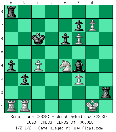 Last move : 1/2-1/2 2023 May 15 22:3:58 [Event "FICGS__CHESS__CLASS_SM__000026"] [Site "FICGS"] [Date "2022.10.23"] [Round "1"] [White "Sorbi,Luca"] [Black "Wosch,Arkadiusz"] [Result "1/2-1/2"] [WhiteElo "2328"] [BlackElo "2300"] 1.d4 Nf6 2.c4 e6 3.Nf3 d5 4.Nc3 c6 5.Bg5 dxc4 6.e4 b5 7.e5 h6 8.Bh4 g5 9.Nxg5 hxg5 10.Bxg5 Nbd7 11.exf6 Bb7 12.g3 c5 13.d5 Qb6 14.Bg2 O-O-O 15.O-O b4 16.Na4 Qa6 17.a3 Bxd5 18.Bxd5 Ne5 19.Qe2 Rxd5 20.axb4 cxb4 21.Nc3 Qd6 22.Ne4 Qc6 23.Bf4 Kb7 24.Bxe5 Rxe5 25.f3 a5 26.Kg2 c3 27.bxc3 b3 28.Rfb1 a4 29.h4 Bc5 30.Qc4 Ra8 31.g4 Kc7 32.h5 Rd5 33.g5 Be3 34.Qxc6+ Kxc6 35.g6 Rxh5 36.g7 Bf4 37.c4 Rh2+ 38.Kg1 1/2-1/2 Follow this game move after move (download)I'd rather have a Pawn than a finger. (Reuben Fine) Ich habe die besten Aussichten, den ersten Preis zu gewinnen - denn jeder muss gegen Steinitz spielen, nur ich nicht! (Wilhelm Steinitz) Debemos de asegurarnos de que el Ajedrez no se convierta en un lenguaje muerto, muy interesante, pero solo para un grupo muy pequeño. (Sytze Faber) L'attaque fait le spectacle, la défense gagne les matchs. (Dicton footballistique) Waiting for chance ? Play in casinos. (FICGS proverb)