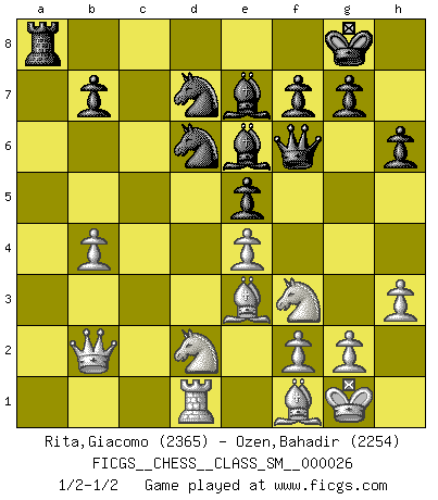 Last move : 1/2-1/2 2022 December 9 21:33:10 [Event "FICGS__CHESS__CLASS_SM__000026"] [Site "FICGS"] [Date "2022.10.23"] [Round "1"] [White "Rita,Giacomo"] [Black "Ozen,Bahadir"] [Result "1/2-1/2"] [WhiteElo "2365"] [BlackElo "2254"] 1.e4 e5 2.Nf3 Nc6 3.Bb5 Nf6 4.d3 Bc5 5.c3 O-O 6.O-O d5 7.Nbd2 dxe4 8.dxe4 Qe7 9.b4 Bd6 10.a3 a5 11.Rb1 Rd8 12.Re1 h6 13.Qc2 Be6 14.h3 Nd7 15.Nb3 Rdb8 16.Be3 axb4 17.axb4 Na7 18.Be2 Nc8 19.Red1 Qf6 20.Nbd2 Qe7 21.Nc4 Qf6 22.Ra1 Be7 23.Ncd2 c5 24.Qb2 cxb4 25.cxb4 Nd6 26.Ra5 Bd8 27.R5a1 Rc8 28.Rxa8 Rxa8 29.Bf1 Be7 1/2-1/2 Follow this game move after move (download)Chess is the gymnasium of the mind. (Blaise Pascal) Jeder Schachmeister war einmal ein Anfänger. (Irving Chernev) Botvinnik trataba de restarle el misterio al Ajedrez, siempre relacionandolo a situaciones de la vida ordinaria. El gustaba de llamar al Ajedrez un típico problema inexacto similar a aquellos de los cuales la gente siempre tiene que enfrentarse en la vida cotidiana. (Garry Kasparov) Le système Elo représente seulement une moyenne. Il est simplement un indicateur de votre stabilité. (Anatoli Karpov) All men can see these tactics whereby I conquer, but what none can see is the strategy out of which victory is evolved. (Sun Tzu)