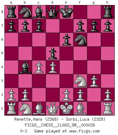 Last move : 0-1 2022 December 8 22:4:59 [Event "FICGS__CHESS__CLASS_SM__000026"] [Site "FICGS"] [Date "2022.10.23"] [Round "1"] [White "Renette,Hans"] [Black "Sorbi,Luca"] [Result "0-1"] [WhiteElo "2368"] [BlackElo "2328"] 1.d4 Nf6 2.Nf3 d5 3.c4 e6 4.g3 Bb4+ 0-1 This chess game has been lost on time (started : 2022.10.23 16:12:58) Follow this game move after move (download)Examine moves that smite! A good eye for smites is far more important than a knowledge of strategical principles. (Purdy) Ja, ich habe einmal eine Blitzpartie gespielt, es war in einem Zug, 1929. --im Interview 1989 (Mikhail Moiseyevich Botvinik) Si tu oponente te ofrece un empate, trata de averiguar porque piensa él que esta en una posición peor. (Nigel Short) J'ai toujours senti une vague pitié pour l'homme qui ne connaît rien aux échecs, tout comme j'en aurais pour un homme ignorant de l'amour. Les Echecs, comme la musique ou comme l'amour, ont le pouvoir de rendre heureux. (Siegbert Tarrasch) As a goal marker shodan is important. As a destination it is a poor place to stop. (Thomas Tamayo)